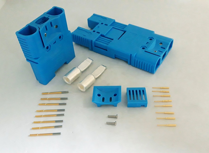 Connecteur bipolaire bleu disponible en 25mm², 35mm² et 50mm². Boîtier en polycarbonate ou PBT plus résistant aux produits chimiques que le polycarbonate et contacts en cuivre recouverts d'argent. Nombreux accessoires disponibles. Peut-être équipé d'auxiliaires (jusqu'à 16 auxiliaires) de 2 sections différentes. Serre-câble intégré.